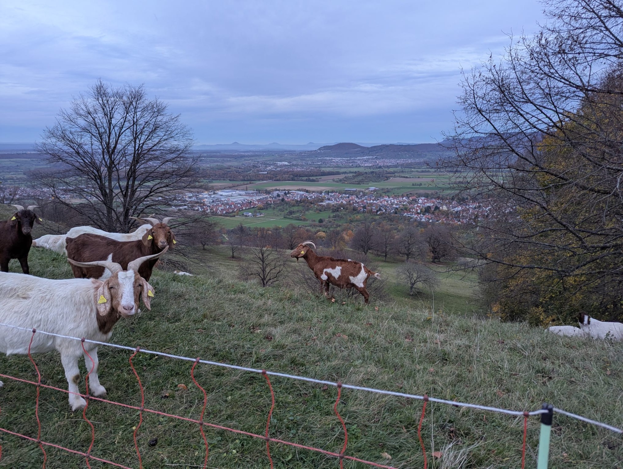 Am letzten Tag im Oktober ging es, wie über ein Jahr im Voraus geplant, auf den Parkplatz Hörnle, der oberhalb von Owen und unterhalb der Burg Teck liegt. Unterhalb des Parkplatzes war eine friedlich wiederkäuende Ziegenherde, die die ankommenden Autos beobachtete. Es gab genügend davon noch kurz vor Einbruch der Dunkelheit.